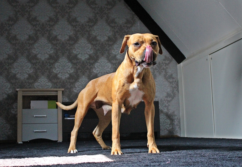 Misia weegt 24kg. Om dat in perspectief te plaatsen: ze is met 51cm een grote AST teef en is 11 jaar.