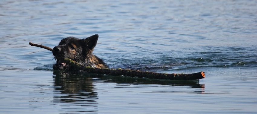 Hahaha, Haakon zwemt met nog veel grotere stokken. Die vind het alleen de moeite voor halve boomstammen.![]()