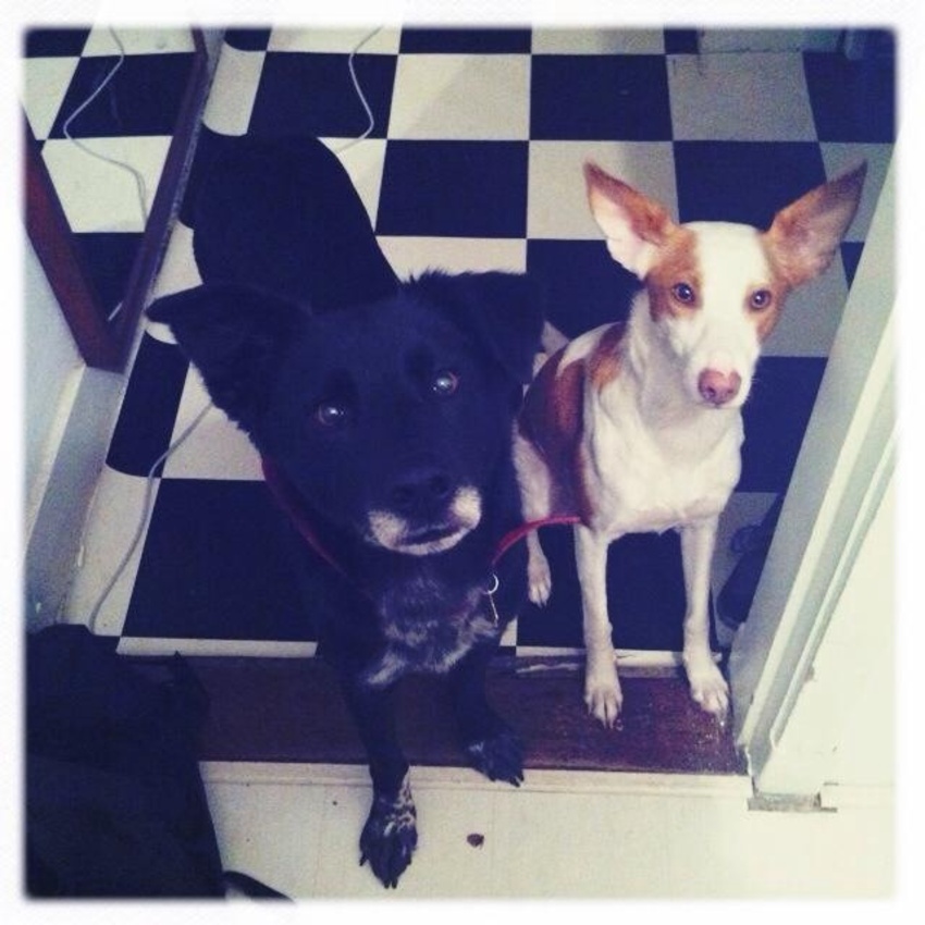 Mijn andere knapperd (hier links) heeft soms twee staande, soms één staande en één hangende en soms twee hangende oren :)