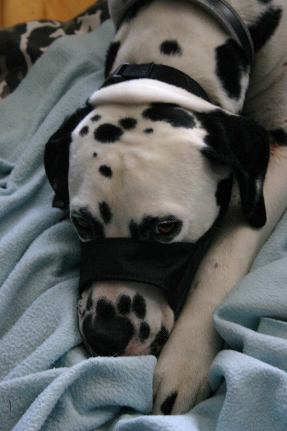 En dan met muilband om het likken tegen te gaan zonder die vreselijke lampenkap op ...
