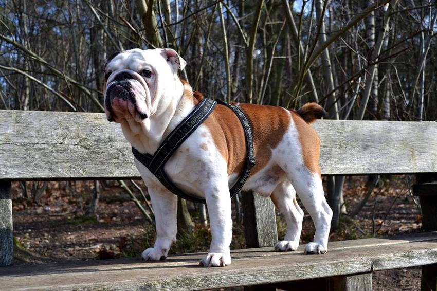 Onze Engelse heeft het Y-tuig omdat hij vrij breed is en een Pro-tuig wat schuurt (naar mijn idee) bij het lopen/rennen.