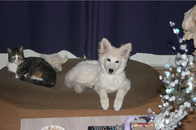 Dus het is echt niet zo dat iedere hond van de kat kan leren hoe zich te gedragen of andersom. En natuurlijk gunde we Mikey alles, maar de katten leven hier ook. En als Mikey wakker was zaten ze alleen maar ergens op of onder verstopt. Als Mikey dan in de bench lag liepen ze heeel voorzichtig even door de kamer. Mikey kon zo ook aan ze wennen en leerde zo ook dat een kat in de kamer ook gewoon rustig kon gaan.