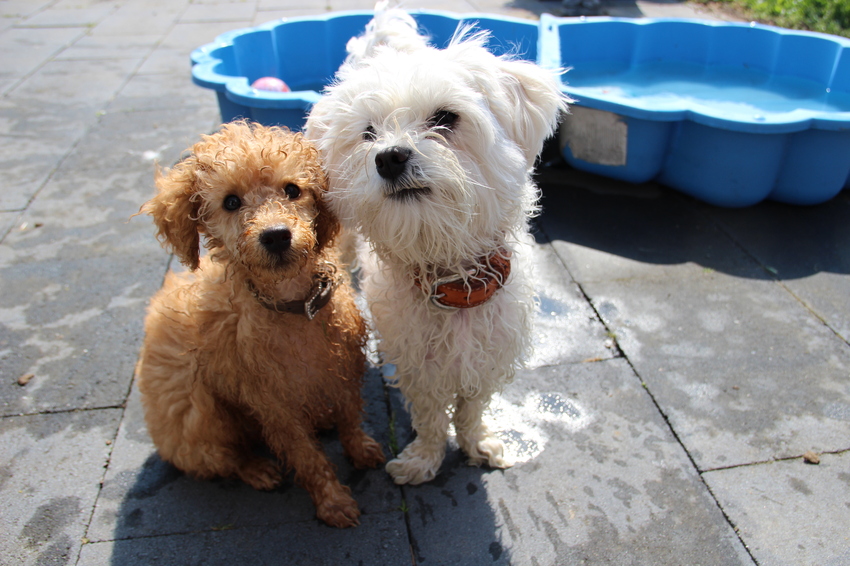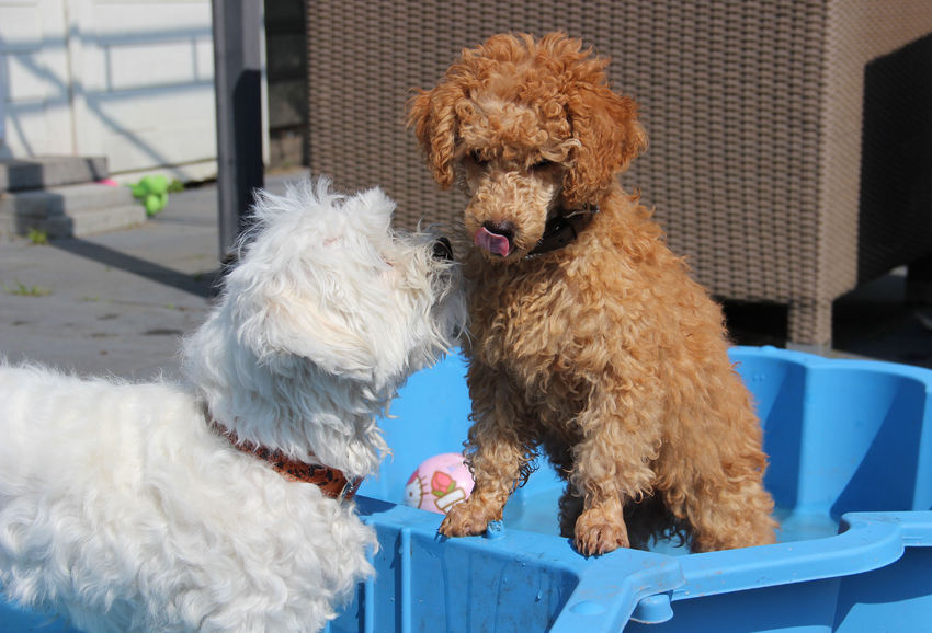 Hij is al bijna even hoog als Gina. Alleen is het nu nog zo'n propje. Gina is best lang. Ik ben wel benieuwd hoe groot hij gaat worden. Heb geen idee hoelang dwergpoedels in de hoogte blijven groeien. Zou het wel leuk vinden als hij wat groter wordt dan Gina. Met zo'n kleine hond ben ik altijd zo snel bezorgd. Heb jij dat niet? :-)