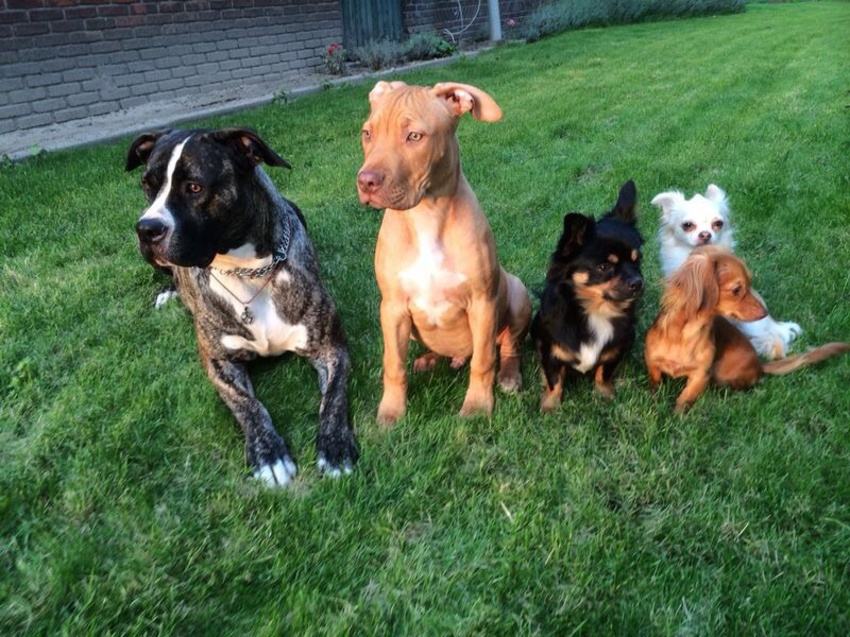 3 doggies Ze zijn stuk voor stuk super leuk! Wat voor een ras is Turbo? Een pitbull? Heerlijk puppekopje heeft ie. En dan de grote bul tussen de kleine chi's
