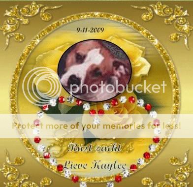 moeten nemen van mijn allerliefste steun en toeverlaat, mijn amstaf kaylee, mijn meissie van bijna 14 jaar. vrijdag was ik naar de dierenarts geweest voor de jaarlijkse inenting. ze bleek in een korte tijd 5 kilo afgevallen te zijn. de da keek verder en het bleek dat ze een baarmoederontsteking had.een operatie zou helpen maar er kon ook uit komen dat er meer was of dat ze het niet zou overleven. ze was de laatste tijd ook haar coordinatie kwijt. de da wilde haar ook niet inenten. ik ben naar huis gegaan om na te denken.wilde ik haar het aan doen om zo'n zware operatie te ondergaan? ik kon haar dat niet aan doen. het hele weekend hebben we afscheid genomen van haar, geknuffeld en verwend. maandag zijn we naar de da gegaan. ze rende zowat naar binnen, terwijl ik er anders altijd mee moest slepen. ik had haar in mijn armen genomen en na het eerste prikje was ze met nog geen 3 minuten al aan het slapen, de tweede prik was er nog niet eens helemaal in en toen was mijn allerliefste meissie al overleden. en dan kom je thuis, geen liefste die op je af komt rennen, die je geen knuffel kan geven, wat is mijn huis leeg. de volgende dag heb ik een heel mooi kistje gehaald waar ik al haar spulletjes in heb gedaan,de speeltjes,voerbak,tuigjes, alles.deze staat nu in de kamer.maar dan komt ineens de twijfel, heb ik wel de goede beslissing genomen?had ik haar toch die kans moeten geven?donderdag belde de da dat haar as terug was en dat ik dat kon halen. ik heb gehuild, geschreeuwd (dat doe ik al de hele week)en zei dat ik haar geen kans had gegeven. de da zei dat hij haar had nagekeken toen we weg waren en er was echt veel meeer aan de hand dan wij dachten.ik had de juiste beslissing genomen, ik had aan haar gedacht.ik ben naar huis gegaan en heb de urn op het dressoir gezet met haar fotoos en kaarsjes erbij.
