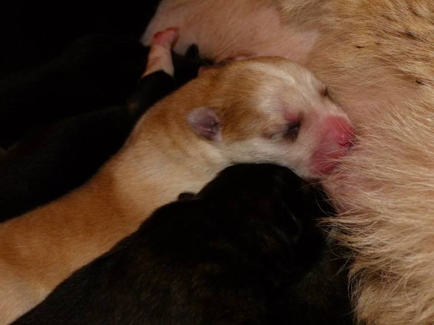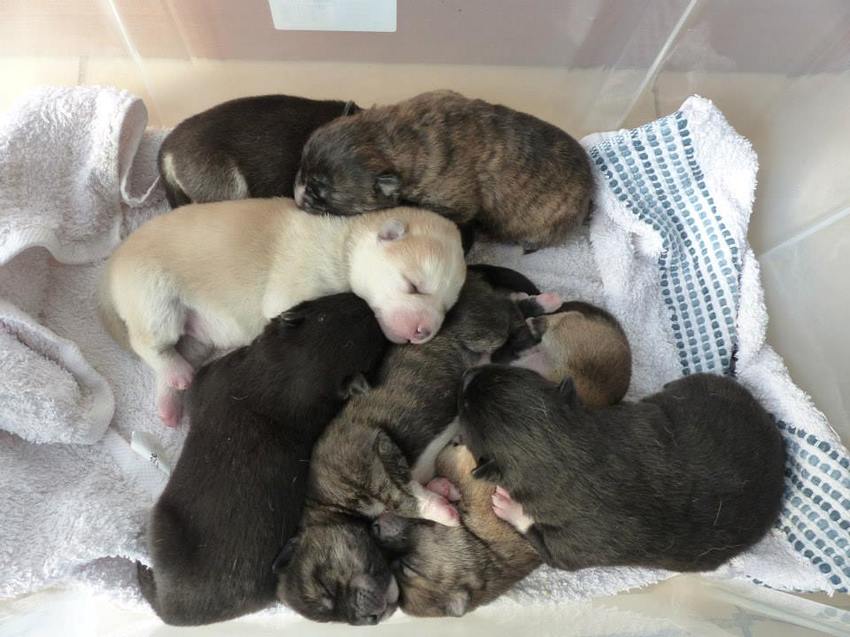 Het kleurrijke gezelschap komt inderdaad allemaal uit één nest, grappig hè. Moeder is grijs, wit met een beetje beige en vader is roodbruin met een zwarte neus.