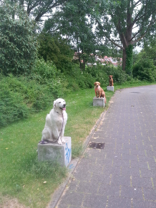 3 doggies Dit is leuk ! Levendige standbeelden. Mooie foto en leuk bedacht ze zo te laten poseren.