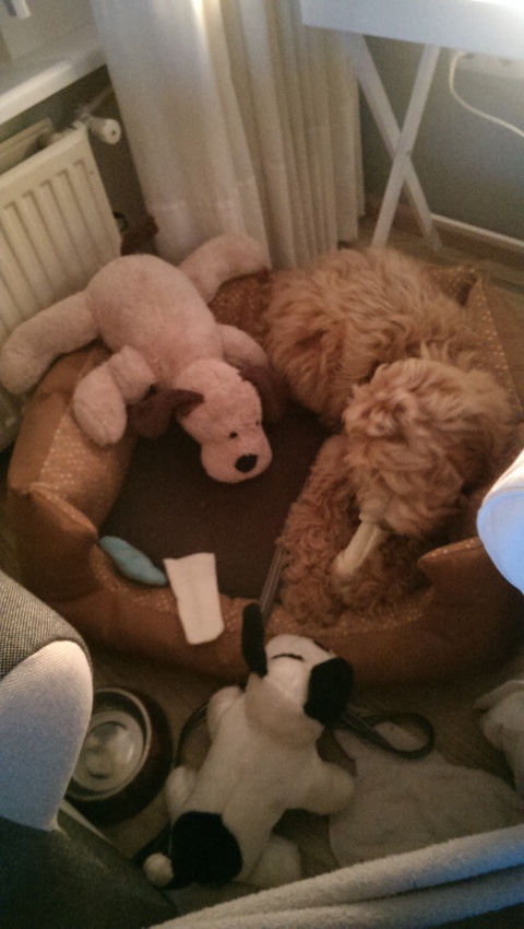 Och, arme schat, heeft hij kennelhoest. We wensen je heel veel beterschap toe Senna!!