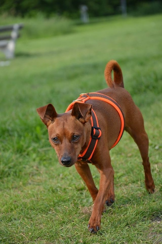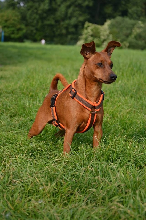 Ik heb zijn tuigje hier laten maken: http://www.my-k9.eu/ Ik was het zo zat om elke dierenwinkel af te gaan... Hij heeft een lastige maat. Hij is klein, maar heeft wel een vrij brede borst.