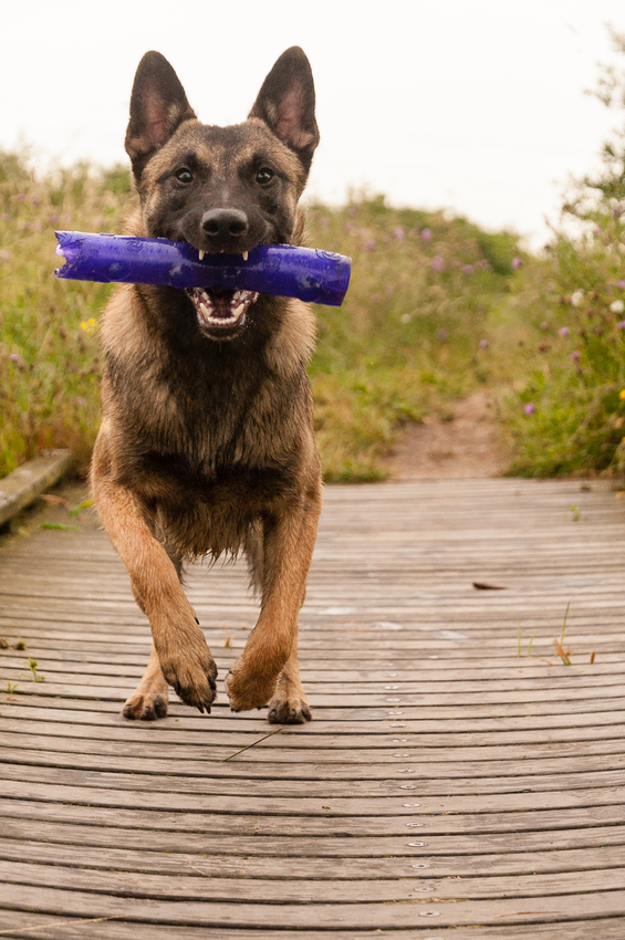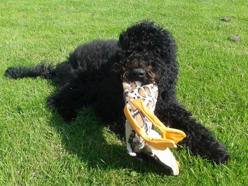 Met zijn nieuwe favoriet (na de tennisbal natuurlijk!) PIEP KIPJE