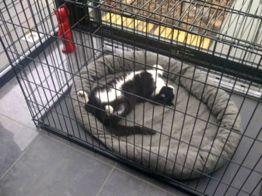Oei, dat lijkt me niet simpel. Kan je het kleine hondje niet laten wennen dat het deurtje dicht gaat en hem of haar dan zo rustig de botjes laten opeten?