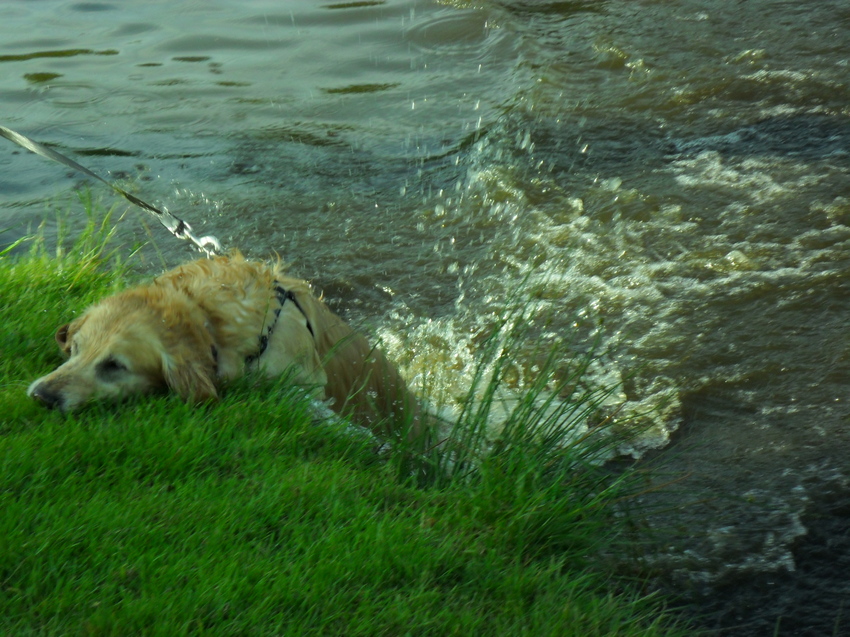 Hier wat foto's van het zwemmen. Het was zo warm, dus mocht hij wel even. Aan de lijn natuurlijk, anders zwemt hij naar het midden en gaat kijken of er nog eenden, waterhoentjes, meerkoeten enz. zwemmen waar hij op kan jagen. En aangezien ze met jongen zitten...