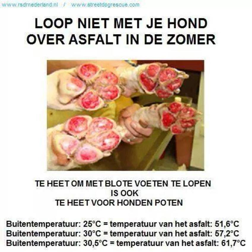 Wij dragen schoenen en zijn ons er niet altijd van bewust hoe heet de ondergrond is waarop we lopen. Asfalt kan heel heet worden in de brandende zon, honden kunnen zelfs hun pootjes verbranden! Druk je hand een 7 seconden tegen het hete asfalt aan om te zien of het te heet is. Je zult gauw genoeg merken of het al dan niet prettig is om op te lopen.