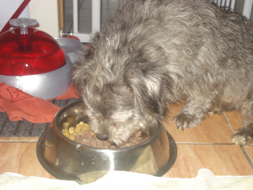 dinsdag avond 29.07.2014 yoni eet beetje( niet alles ) speciale worst van de dierenarts brokjes laat hij liggen ;-)