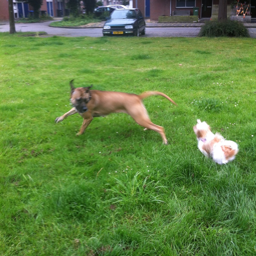Voor Macy zijn er ook niet veel speelmaatjes.. Laatst kwam ik een shih tzu puppy van 5 maanden tegen, daar heeft ze lekker mee gespeeld ![]()