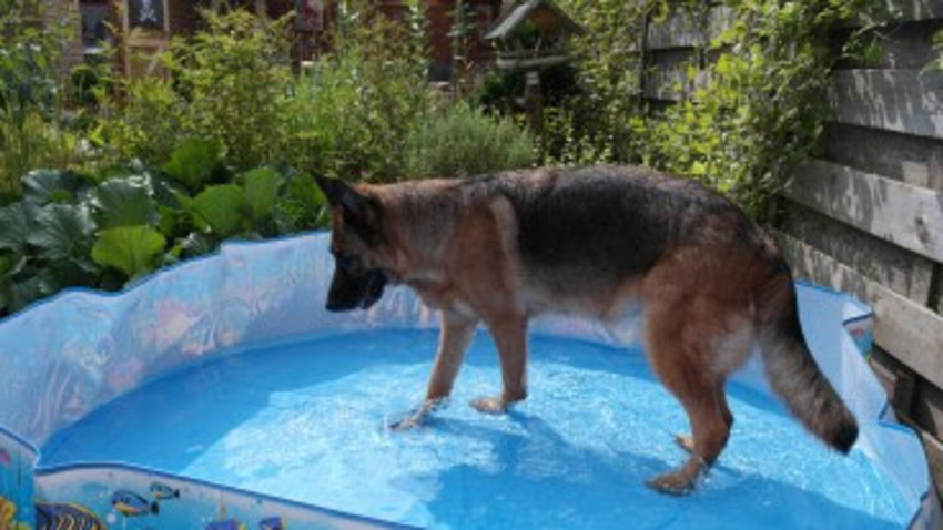 Om onze herder koel te houden gaan we zwemmen bij het meer of gek doen in het zwembadje of met de tuinslang. Ze is gek op water ![]()