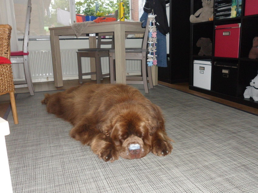 kom binnen, en ach arme Bamse, een beetje oververhit, snel alles tegenover elkaar open gezet, de ramen stonden wel open, maar de deur was dicht, en ja sufferd gaat dan voor de deur liggen.