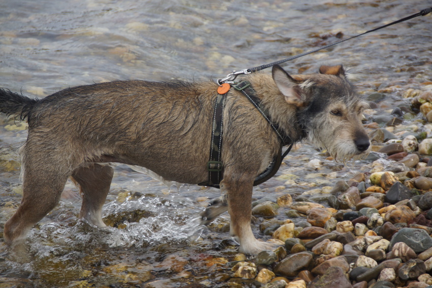 Ik kwam op het idee om zelf eens een foto te nemen van Dobby die druipend nat was. Ik zie het vaak genoeg en kijk dan snel of hij er nog dun genoeg uit ziet, maar van een foto kijken is net wat makkelijker. Daarom maakte ik deze foto. Hij kwam net uit het water en moest zich nog uitschudden.
