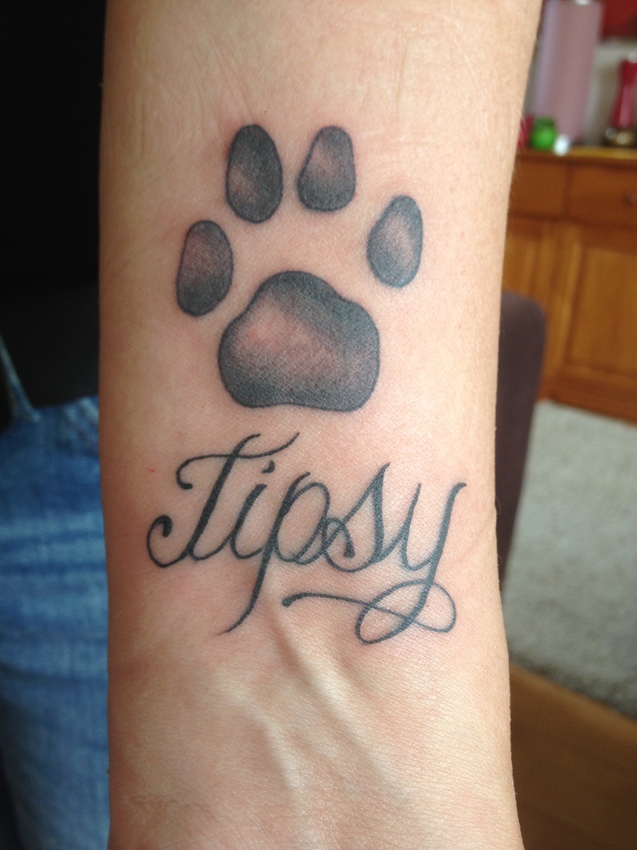 Vorig jaar oktober is mijn allergrootste liefde overleden. Mijn Tipsy. Ik heb het er nog steeds heel moeilijk mee en denk elke dag wel 100 keer aan haar. Ik mis haar zo ontzettend veel. Toen Tipsy overleed hebben wij een pootafdrukje laten maken in gips. We hadden dit geprobeerd toen ze nog leefde maar die eigenwijze troela liet het niet toe want haar pootjes waren heilig. Nu heb ik het pootadrukje laten uittekenen bij de tattooshop en dit is het resultaat.