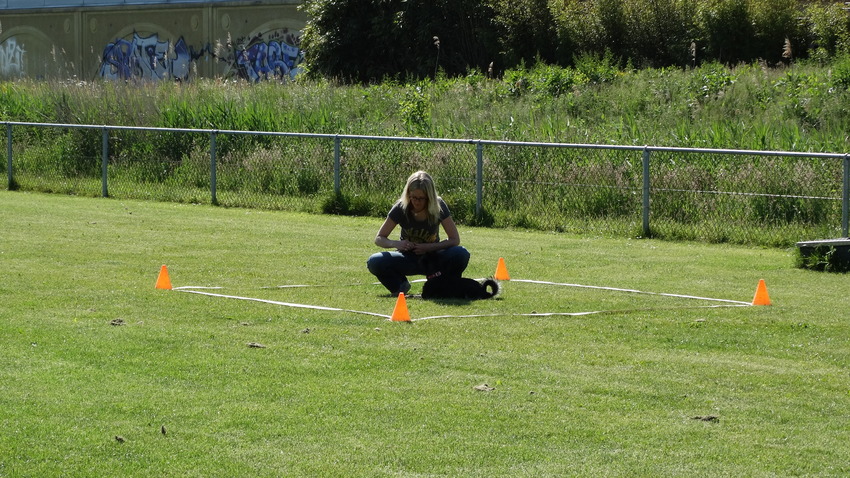 Daarna was de vak oefening aan de beurt en toen begon het ook erg hard te regenen. Dus mevrouw Moh wou niet gaan liggen in het vak. Na beetje aan dringen ging ze toch liggen, dus ik loop het vak uit en mevrouw zat alweer. Toch de Moh maar voor geroepen, daarna aan de voet. Dat ging weer perfect. Toen weer naar het vak gestuurd en Moh was onderweg, maar bedacht zich toen volgens mij ineens dat ze dan weer moest gaan liggen in het zeiknatte gras en liep toen maar weg. Dus ik zei tegen de examinator `laat maar dit wordt hem niet, ik kan wel boos worden en haar willen dwingen maar dan doet Moh het toch niet`