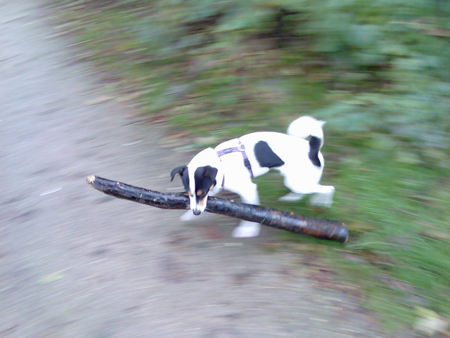 Bodhi probeert ook hele boomstammen mee te nemen naar huis... Meestal laat hij ze gauw weer vallen, want is toch wel zwaar zo'n grote tak