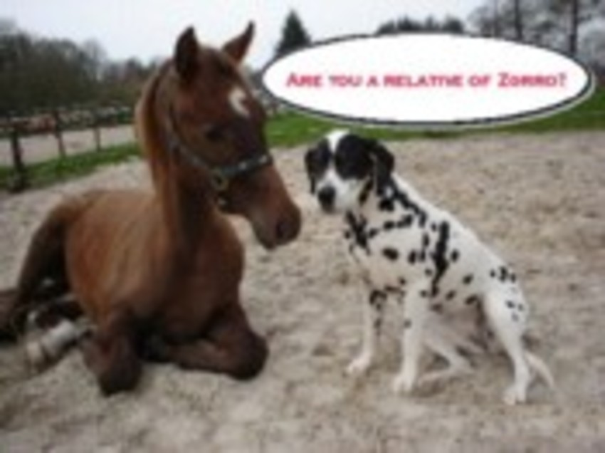 Veulen verbaasd, over de Dalmatiër met masker.