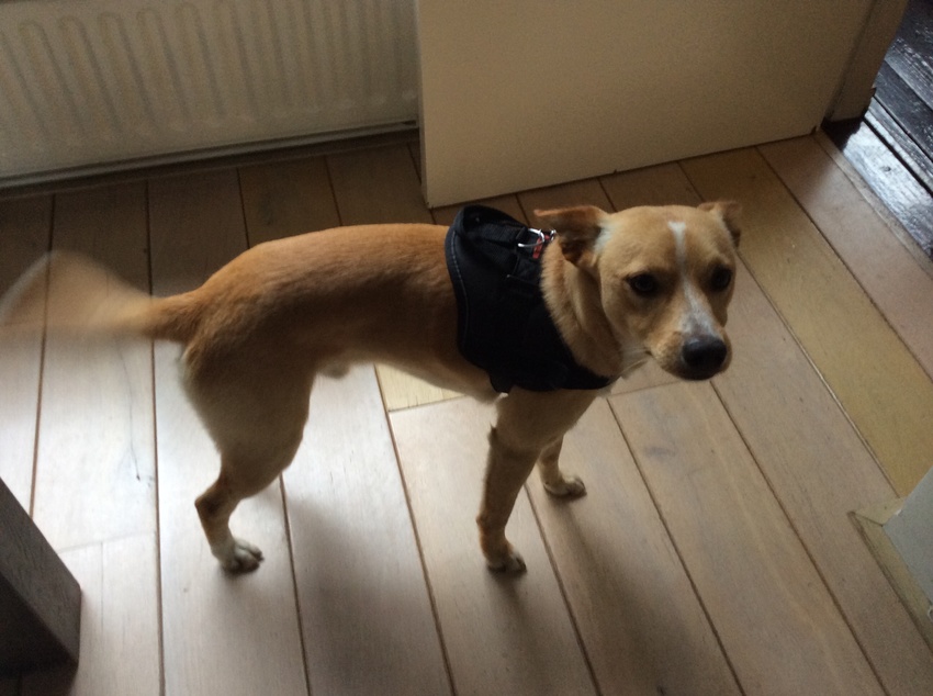 "Bobby komt van de stichting Animal in Need...dus een Spanjaardje....ik meet hem net..rond de 40 cm hoog en maat voor het tuigje 50 cm...tis een sprietje...wat was het een mini hertje toen we hem kregen.