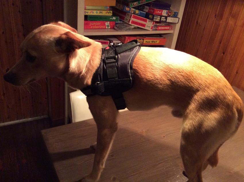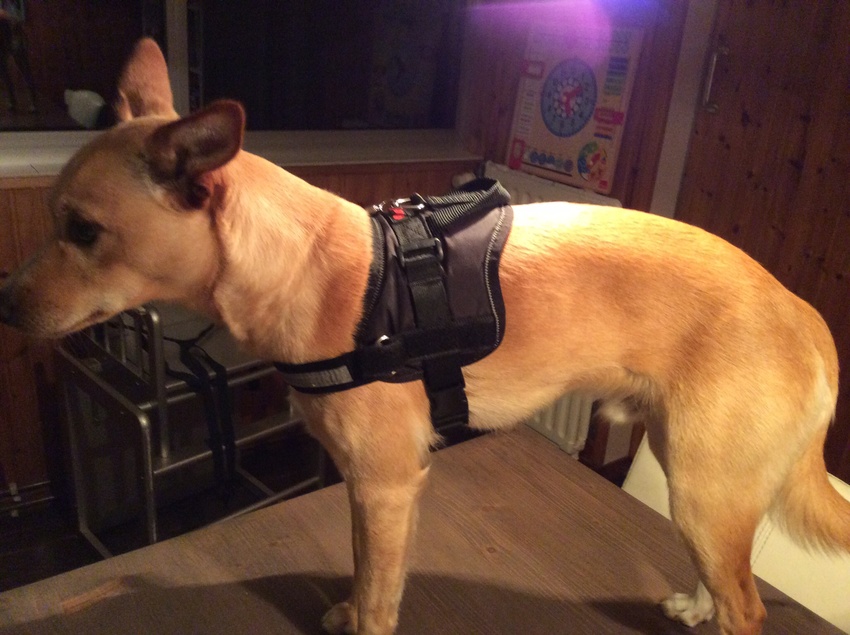 Ik heb een Tre ponto tuigje voor Scott. Deze zit goed, niet strak achter de poten. En hij komt hier niet uit.