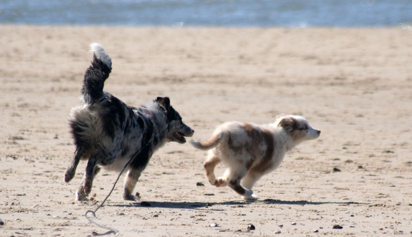 Wat hebben die 2 het leuk gehad samen! Ze zijn helemaal aan elkaar gewaagd, allebei best ruig spelen samen met het nodig geblaf en gebrom af en toe. Maar wel erg leuk spel om zo naar te kijken ![]()