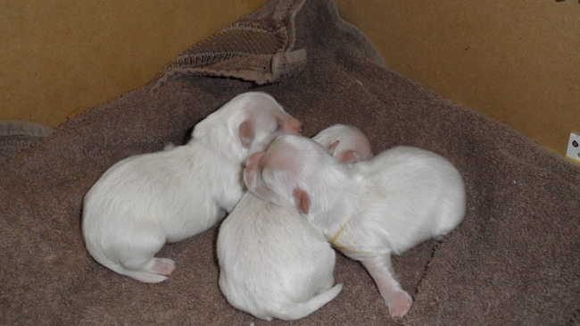 Kahlua met broertjes en zusjes als pups, en een jaar later. (beetje wazige foto.