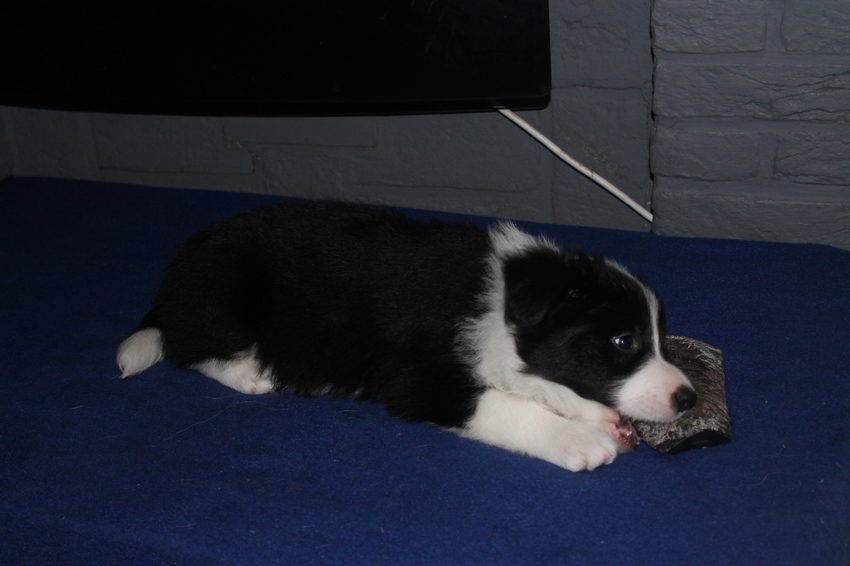 hij komt super goed overeen met onze sem,, en hij doet het al heel flink thuis nogwel wat pieperig maar dat gaat vanzelf wel over.. hij kan ookal op commando zit en down zo schattig <3 <3