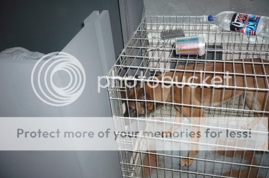 Zo staat het dus als ze binnen is. Haar bench tegen de werpkist zodat ze kan kiezen waar ze gaat liggen