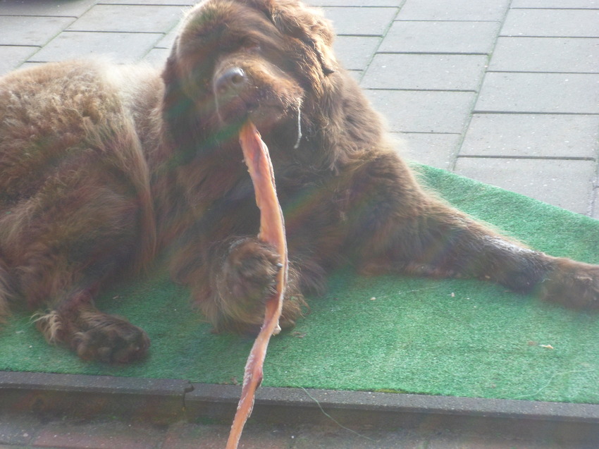 hier een zeer tevreden Bams, lekker kluivend aan een runderkophuid.... even gekocht, wel duur maar je hebt wel wat, vijf van deze lange staven, nee een is genoeg natuurlijk.