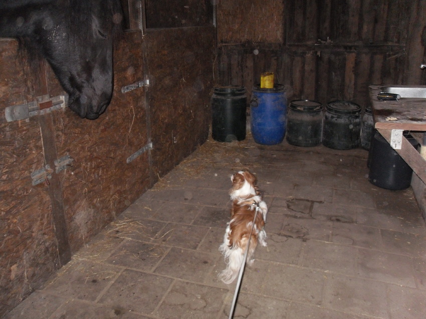 Buiten" kijken" waarmee Harry aan het spelen is en erna even snuffelen aan de paarden voederbal