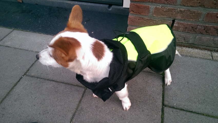 Ook Loes draagt nu een jasje/dekje. Ze heeft geen ondervacht, dus help ik haar een handje als we gaan wandelen.