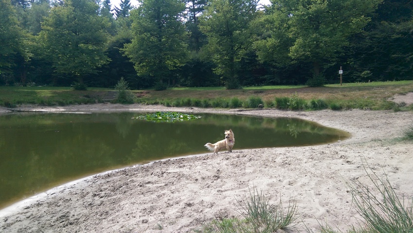 Heerlijk in het zonnetje door het bos wandelen en bij de vijver uitkomen. Lekker rondrennen en in het water duiken als een malle! Zelfs de waterlelie bladeren moesten er aan geloven haha.