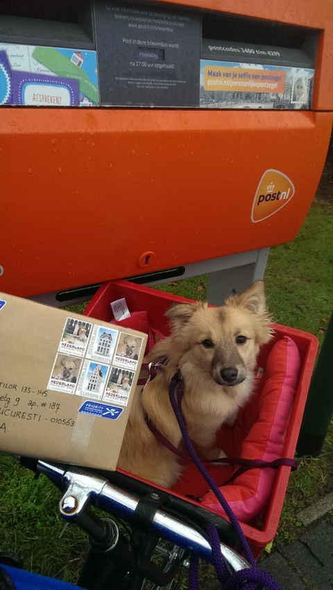 We zijn gelijk langs de brievenbus gefietst om een verjaardagspakketje voor Lupa haar pleegmama te posten. Onder het saaie bruine papier zit een vrolijk pakketje met wat kleine cadeautjes. En natuurlijk met de Lupa postzegels!