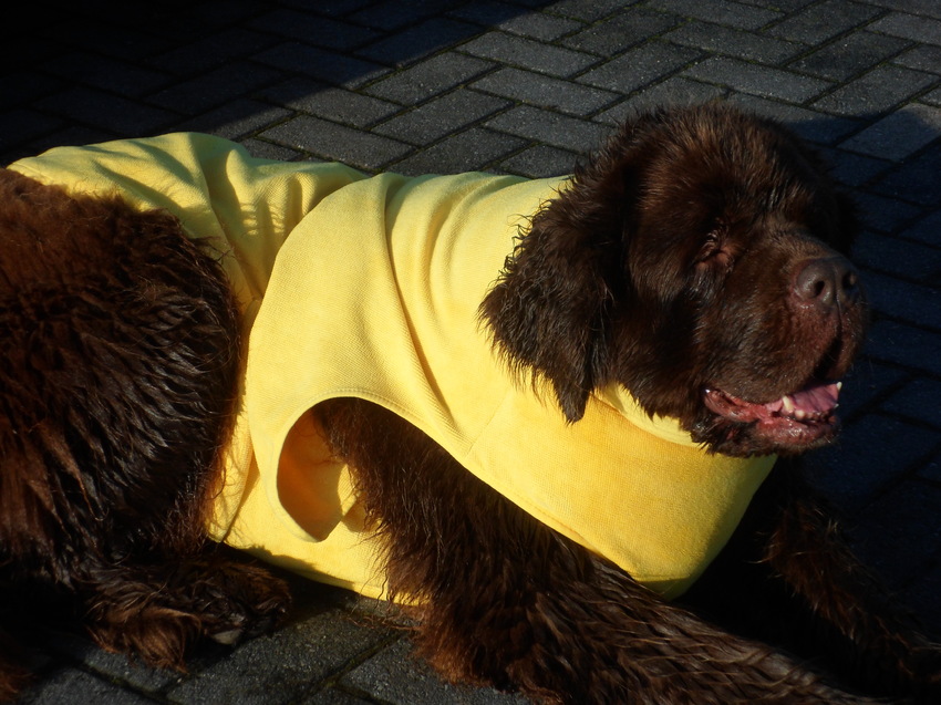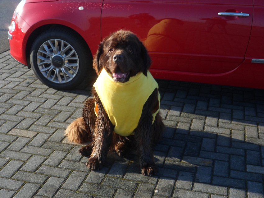 een tevreden hond, zodra we thuis waren wel de jas uitgedaan, en verder droog geblazen, de jas was toch kleddernat.