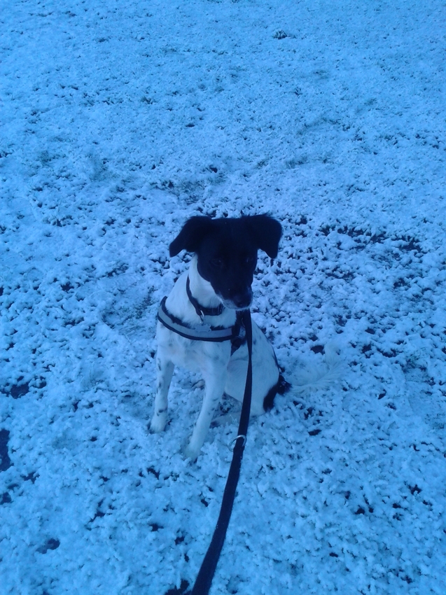 Maar echt sneeuw is het niet, een klein hagelachtig laagje is het. Bacchus vind het maar raar en probeert het op te eten. De glad bevroren plassen waren een beetje eng, normaal loopt hij om een plas heen, maar nu ging hij er dwars overheen en schrok ervan toen het kraakte.