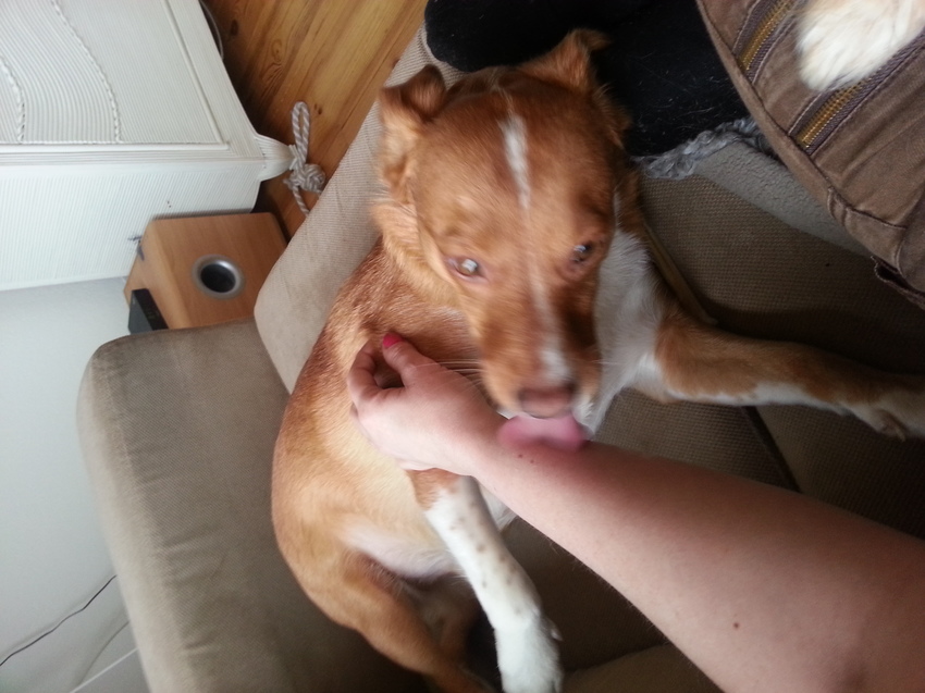 Voor Obi is likken ook belangrijk. Dat moet gewoon en dan niet met een volle tong maar alleen het puntje uit z'n bek, precies zoals jouw hond op de foto. Ook zo over je arm en dan het liefste ook nog met 1 van z'n voorpoten over mijn been (als ik ook op de grond zit) of over mijn arm.