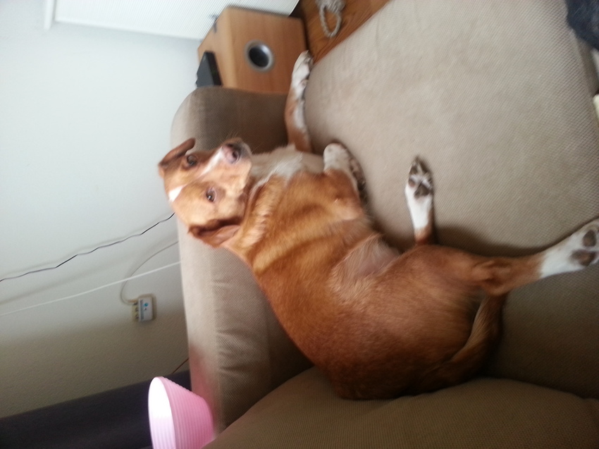 As ze echt blij is dan gaat ze ook met haar gat in de lucht, voorpootjes krabbelend heel snel dol heen en weer even.