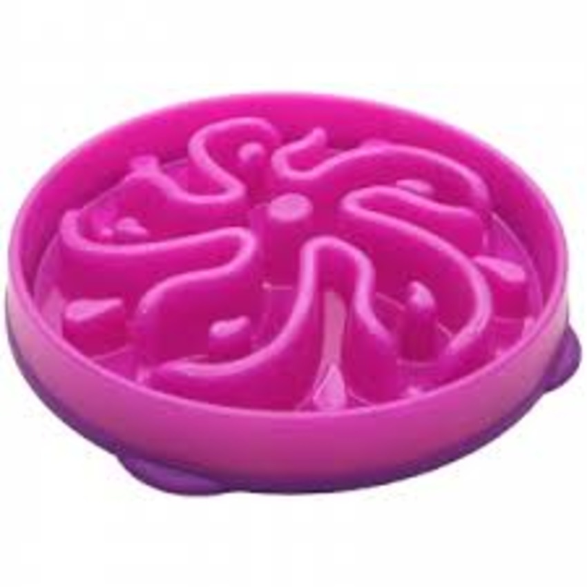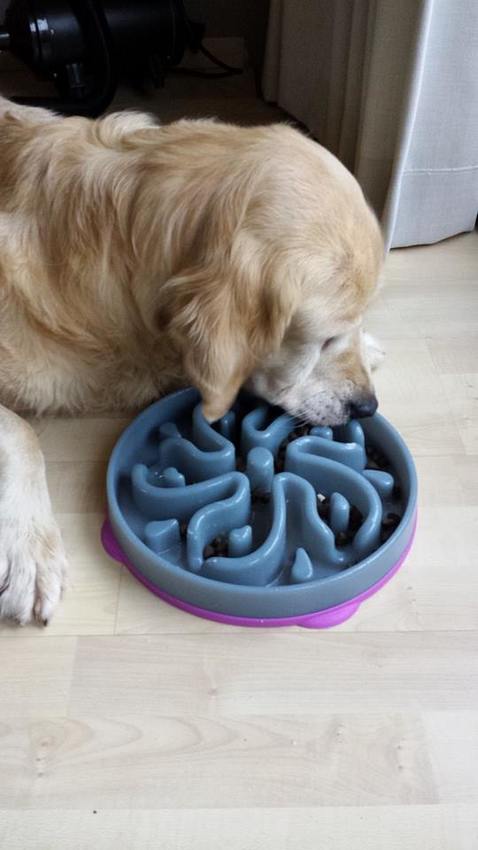 zijn gewone grote bak en daar grote kiezelstenen in doen.Dat helpt bij onze hond voldoende de stenen gaan ook de vaatwasser in en de volgende morgen is de bak weer klaar voor gebruik.Als hij te snel eet komt alles eruit en nu moet hij bewuster rustiger eten en kauwt daardoor ook zijn brokken want het was hap slik weg .