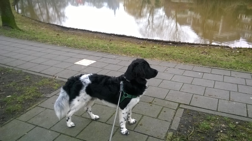 toch wordt het lente , Bams is niet te houden, een en al vrolijkheid... de temperatuur is nog net te doen, wordt er te lang gewandeld , zucht dan heeft ze het toch echt heel warm al....