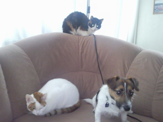 hier zijn onze die huisdieren het was niet makelijk om alle drie makelijk op de foto te krijgen maar het is me wel gelukt