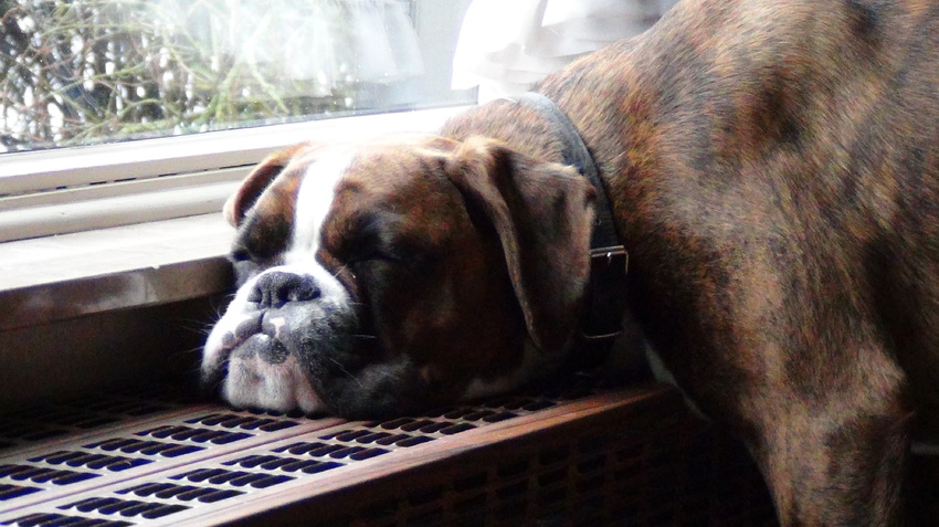 Voor de brandende kachel ,dat was het lievelingsplekje van mijn vorige boxer Velvet .