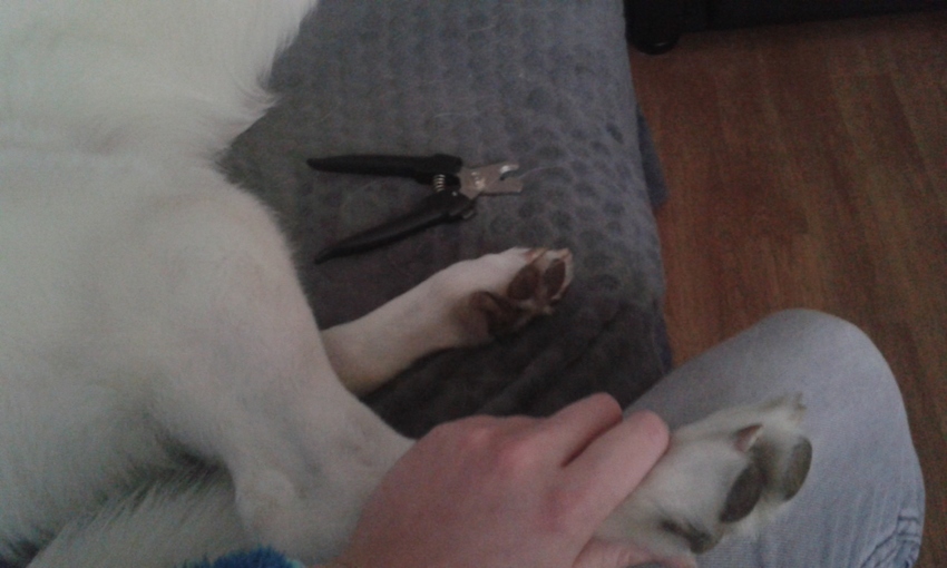 Heb ik niemand in de buurt die mij helpt dan trek ik tuin handschoenen aan smeer wat smeerworst op handdoek zij gaat likken ik ga knippen......