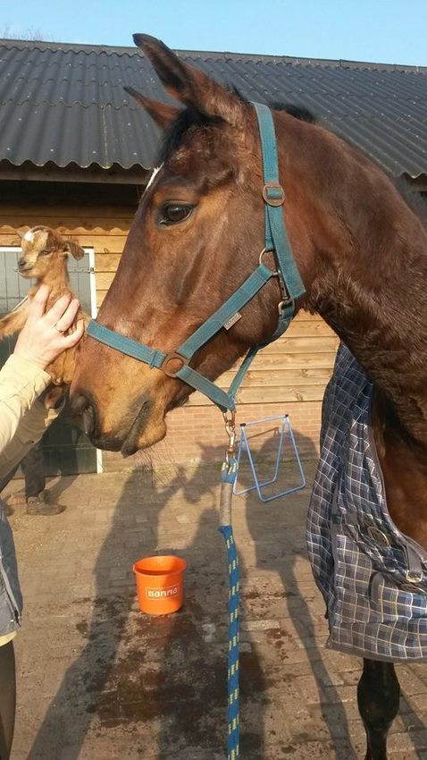 Hier mijn paard vanmiddag die kijkt naar een baby geitje, het geitje is zo klein die zie je haast niet.![]()