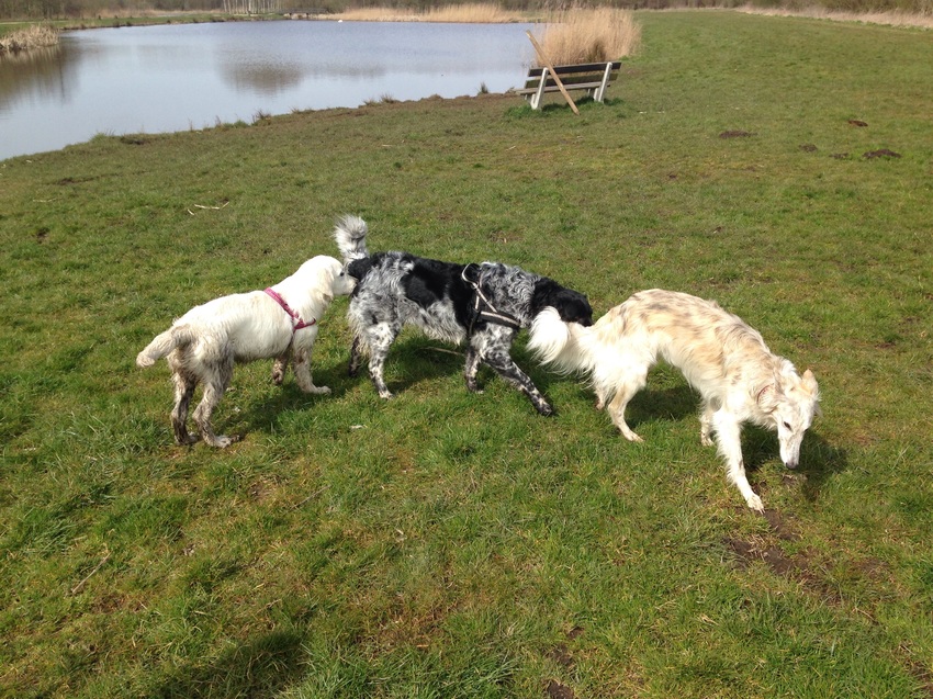 Heerlijk een stuk in het bos gelopen vandaag, Aiko heeft zich de hele wandeling vermaakt met een whippet waar ze bevriend mee is en onderweg nog wat gespeeld met wat andere hondjes. En ze dook voor het eerst expres het water in! Ze kon de kant niet meer zelf opkomen dus ik heb haar aan haar tuig eruit gehesen.