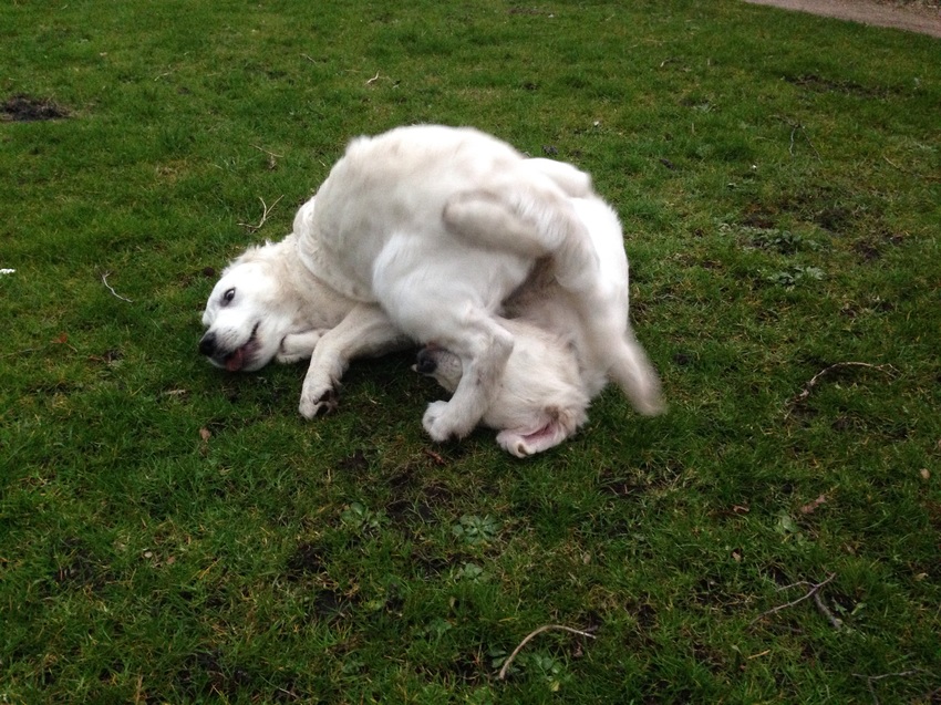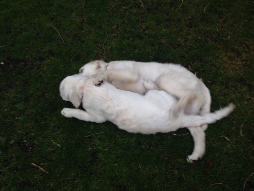 Maar goed, na het trainen kwamen we nog een Golden pupje tegen! Net zusjes, ze was 1 week ouder dan Aiko en nóg lichter van kleur. We hadden onwijs moeite ze uit elkaar te houden, ze flitsten voorbij dus je zag het niet goed en ze hadden allebei bananen in hun oren. Het waren meteen dikke vriendinnen, ze hebben zo heerlijk met elkaar gestoeid.
