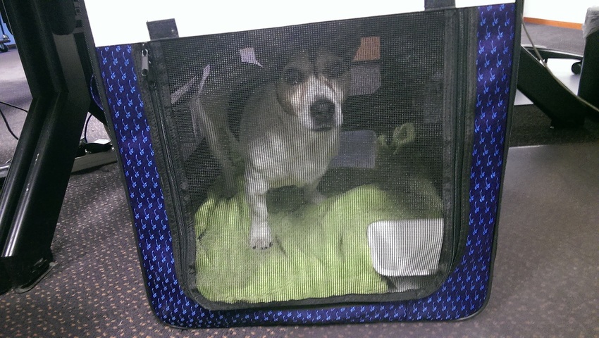 Puck gaat een heel enkel keer mee naar 't werk. Alleen als ik geen oppas heb.